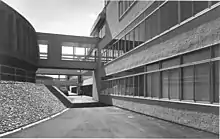 The existing building dates from the early 1970s and replaced a secondary school in nearby Rosyth. It was designed by architect Gavin Haveron McConnell[1] who was influenced by Le Corbusier and introduced some elements into the structure such as the pilotis which give open circulation under part of the building, and the accessible roof space. In 2004, the building received Listed status (Category B) from Historic Environment Scotland for its inventive Late Modern design.[2]
