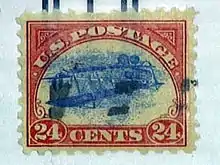 During the 1910s, the United States Post Office had made a number of experimental trials of carrying mail by air. These were shown by the first stamp in the world to picture an airplane (captioned as "aeroplane carrying mail"), one of the U.S. Parcel Post stamps of 1912–13.[7] The Post Office finally decided to inaugurate regular service on May 15, 1918, flying between Washington, D.C., Philadelphia, and New York City. The Post Office set a controversial rate of 24 cents for the service, much higher than the 3 cents for first-class mail of the time, and decided to issue a new stamp just for this rate, patriotically printed in red and blue, and depicting a Curtiss Jenny JN-4HM, the biplane especially modified for shuttling the mail. The stamp's designer, Clair Aubrey Houston, apparently troubled to procure a photograph of that modified model (produced by removing the second pilot seat from the JN-4HT to create space for mailbags, and by increasing the fuel capacity). As only six such aircraft existed, there was a 1-in-6 chance that the very plane engraved on the stamp by Marcus Baldwin—Jenny #38262—would be chosen to launch the inaugural three-city airmail run; the plane on the stamp was indeed the first to depart from Washington on May 15, taking off at 11:47 A. M.[8]