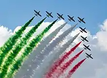 Flight formation aerobatics are flown by teams of up to sixteen aircraft, although most teams fly between four and ten aircraft.[8] Some are state funded to reflect pride in the armed forces while others are commercially sponsored. Coloured smoke trails may be emitted to emphasise the patterns flown and/or the colours of a national flag.
