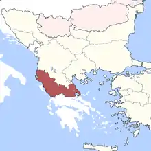 The Ioannina Eyalet (Ottoman Turkish: ایالت یانیه Eyālet-i Yānyâ)[1] was an administrative territorial entity of the Ottoman Empire located in the territory of present-day southern Albania, central and northern Greece. It was formed in 1670 and its administrative centre was Ioannina. In period 1788—1822 Ali Pasha, the sanjakbey of Trikala, seized control over Ioannina and after enlisting most of the local brigands under his own banner took advantage of a weak Ottoman government to gain control over the Ioannina Eyalet and most of Albania and continental Greece, transforming it into the semi-autonomous Pashalik of Yanina. After he was killed in 1822 the Ottoman Empire reestablished the Ioannina Eyalet which existed until establishment of the Janina Vilayet in 1867.