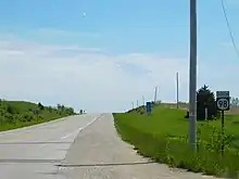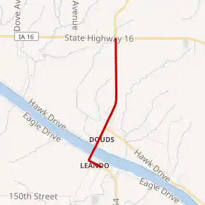 Iowa 98 began in the census-designated place (CDP) of Leando at an intersection with Clay Street. East of the intersection, the road continued as Van Buren County Road V64 (CR V64) while Iowa 98 headed to the west. For the first one-fifth mile (320 m) of its routing, the two-lane highway ran parallel to and approximately 400 feet (120 m) from the Des Moines River. The highway then turned to the north and crossed the river. On the northern banks, it entered Douds, which is also a CDP. Douds sprawls for three-quarters mile (1.2 km), despite only having a population of 152 in the 2010 Census.[3] Iowa 98 continued north for another three-quarters mile (1.2 km) until it reached Iowa 16. North of the intersection, the road continued again as CR V64.[4] The entire route had an annual average daily traffic of 1060 vehicles.[1]