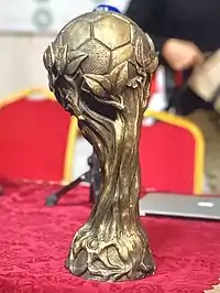 The Iraq FA Cup trophy is designed in the shape of a tree with eighteen roots, branches and leaves encircling a ball.[8] The number eighteen refers to the eighteen governorates of Iraq. The image of Iraq as a tree is a metaphor suggesting that the nation may fall ill (just like a tree in autumn) but will inevitably bloom again. Unveiled on 6 April 2022, the trophy is the work of the famous sculptor Ahmed Albahrani who also designed the 2015 World Men's Handball Championship trophy.[9]