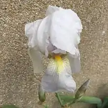 The large flowers,[18][14][26] are up to 25 cm (10 in) in diameter (or across).[21] They come in white,[15][28]: 142 [29] (sometimes described as 'dead white,[2]) or greyish white,[10][14] or bluish white,[19]: 121 [21][26] or very pale lavender.[6][12] They are slightly tinged, or flushed with blue,[10][20][25] or pale blue,[2] or lavender.[13][7][16]: 22 They are especially tinted when in bud.[22] The flowers are often confused with Iris albicans (which also has white flowers).[23][25]