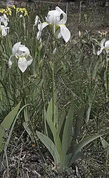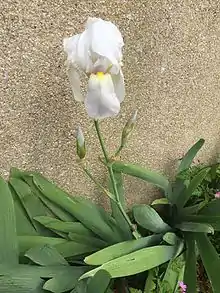 It has a straight,[18] stem or peduncle, that can grow up to between 38–100 cm (15–39 in) tall.[13][19] : 63 [20] It may reach up to 75–100 cm (30–39 in) after about 3 years.[12] Although it may reach 121 cm (48 in), (in ideal conditions).[1][21] The stems have 2 – 4 branches.[17][10][22] The branches reduce in size as you go up the stem,[10] starting from the middle.[3] The branches can be long, when compared to Iris albicans (another white flowered iris sometimes called Iris florentina subsp. albicans (Lange) K.Richt.),[22][23]