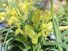 The flowers come in a range of shades of yellow, from pale yellow,[4] to soft yellow,[2] and rich-yellow.[5] The perianth tube generally is about 3 – 4.5 cm long.[3] It has falls that have a wide wing and a raised pale yellow crest, the standards are short and deflexed.[6]