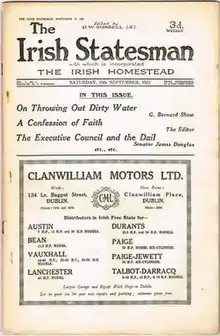 The Irish Statesman was a weekly journal promoting the views of the Irish Dominion League. It ran from 27 June 1919 to June 1920, edited by Warre B. Wells, assisted by James Winder Good,[1] and with contributions from W. B. Yeats, George Bernard Shaw, and George Russell ('AE').[2] The League's manifesto was first published in the journal's first issue.[3]