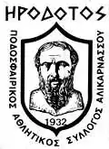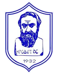 Irodotos Football Club, short for Podosferikós Athlitikós Sýllogos Alikarnassoú Iródotos (Greek: Ποδοσφαιρικός Αθλητικός Σύλλογος Αλικαρνασσού Ηρόδοτος, meaning Irodotos Football Sports Club of Halicarnassus) and also simply known as Irodotos, is a Greek football club, based in Nea Alikarnassos, Heraklion. The club is named after the ancient historian Herodotus, descended from Halicarnassus, Asia Minor, whose bust is also used as the club logo. Irodotos was established in 1932 by refugees from Asia Minor (and specifically the site of modern Bodrum, then still called Halicarnassus), who were displaced following the Greco-Turkish War in 1922. By acclamation, Irodotos is considered the third most successful club in Heraklion in terms of achievements, due to its consistent presence in the Second and Third national divisions, but has maintained a considerable fan base, and a longstanding rivalry with local Superleague side OFI, despite the fact the two haven't met in national competitions for almost 30 years. The club currently competes in the Football League, the second tier of the Greek football league system, while also administering amateur men's football and basketball departments. In the past it also had departments for wrestling, cycling, women's football and athletics. Its colours are blue and white.
