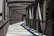 The park is contiguous with a rail trail that crosses Snoqualmie Pass. The trail is located within the former right-of-way of The Milwaukee Road, officially the Chicago, Milwaukee, St. Paul and Pacific Railroad. Most of the right-of-way between Cedar Falls and the Idaho border was acquired by the state, through a quitclaim deed, as a result of the railroad's 1977 bankruptcy. As part of the reorganization of the company, the railroad embargoed its lines west of Miles City, Montana, in 1980 and ceased service in Washington. The state acquired the land in the early 1980s and eventually converted the right-of-way west of the Columbia River into a 110-mile (177 km) hiking, mountain biking, and horseback riding trail. The trail, known as the Palouse to Cascades State Park Trail, continues beyond Iron Horse State Park to the Idaho border.[1][2] Iron Horse State Park contains the most developed portion of the trail.