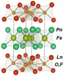 Iron-based superconductors (FeSC) are iron-containing chemical compounds whose superconducting properties were discovered in 2006.[2][3] In 2008, led by recently discovered iron pnictide compounds (originally known as oxypnictides), they were in the first stages of experimentation and implementation.[4] (Previously most high-temperature superconductors were cuprates and being based on layers of copper and oxygen sandwiched between other substances (La, Ba, Hg)).