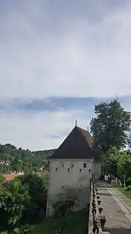 The Ironsmiths' Tower (Romanian: Turnul Fierarilor, German: Schmiedeturm) is located behind the Monastery Church of Sighişoara, in Mureș County, Romania. Its main role was to protect the church in case of a siege. It was built in 1631 on the foundations of the old Barber's Tower. From inside the citadel it appears relatively small, but is impressive when viewed from the exterior of the wall.