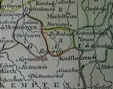 As an imperial abbey Irsee enjoyed Imperial immediacy. While its small territory covered 118 square kilometers and 22 villages and hamlets, its abbot ruled over 3200 to 4200 subjects.[3] The abbot had seat and voice on the Bench of the Swabian prelates at the Imperial Diet. In case of a declared war, the abbot was required by the Swabian Circle to supply a contingent of one officer and 61 infantrymen.[4]