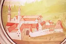 In 1699 the dilapidated church tower collapsed and damaged the choir of the old Romanesque church built in 1194, which prompted Abbot Romanus to undertake the revamping of the church and monastery buildings.[5] The construction project was greatly expanded by its successor, abbot Willibald Grindl and the monastery buildings were completely rebuilt.[6] The plans have been attributed to Magnus Remy, an Irsee monk, who also created many of the paintings in the church. During the long rule of Abbot Bernard Beck (1731-1765), Irsee became a center of intellectual and scientific life in Swabia and beyond. Irsee's natural history collection with its instruments of mathematics and physics were famous.[7]