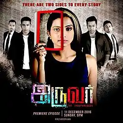 Iruvar is a 2016 Singaporean-Tamil-language mystery soap opera starring Indra, Gayathri Segaran, Vishnu, Varman, Jabu and Balakumaran. The first one-hour episode was aired on December 11, 2016.[1][2] It replaced Azhagiya Thamizh Magal and it broadcast on MediaCorp Vasantham from December 11, 2016 to 29 March 2017 for 62 episodes. The show's final one-hour episode aired Wednesday 29 March 2017.