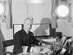 He also served in the Second World War as Flag Captain commanding HMS Hood and Chief of Staff of the Battle Cruiser Squadron from 1939; it was in this capacity that he took part in the Attack on Mers-el-Kébir in July 1940.[3] He then served as Commander of Destroyers in the Mediterranean Fleet from 1941, taking part in the Battle of Crete and preventing Axis troops from landing on that island in May 1941, before becoming Commander of Destroyers in the Home Fleet from 1943.[1] He was made Senior Naval Officer, Western Atlantic from 1944; this role evolved into Commander-in-Chief, America and West Indies Station in 1945.[1] He welcomed President Harry S. Truman to Bermuda after the War[4] and retired in 1947.[1]