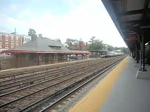 Irvington's former New York Central Railroad station, built in 1889,[4] has been a contributing property of the Irvington Historic District since January 15, 2014.[5] Since being retired as a ticket office in 1957, it has been utilized as an art and curio shop, an office for the Weyerhauser lumber yard which was located on the other side of the tracks – now Scenic Hudson Park[6] – and the office of an architectural firm. In 2016, with the addition of an outdoor garden, it was converted into a 20-seat café serving frozen yogurt.[4]