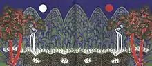 Irworobongdo (Korean: 일월오봉도, Hanja: 日月五峯圖) is a Korean folding screen with a highly stylized landscape painting of a sun and moon, five peaks which always was set behind Eojwa, the king’s royal throne during the Joseon Dynasty.[1][2] It literally means "Painting of the Sun, Moon and the Five Peaks" and is also called "Irwoldo" ("Painting of the Sun and Moon") or "Irwolgonryundo" ("Painting of the Sun, Moon and Mount Kunlun"). The sun and moon symbolize the king and queen while the five peaks denotes a mythical place. The screen serves to display the majesty of the Joseon royal court.[3]