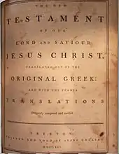 Collins's bible used higher quality printing types and better techniques than conventional printing of the time period. His bible was proofread up to eleven times before being published.[21] Bible scholars note that it was one of the most textually accurate bibles ever printed[32][42] and was one of the earliest American family bibles published.[43][44] It was the largest publishing job ever done in America up to that point[21] and three thousand bibles were pre-sold before printing started.[45] It was different than the customary editions of the Christian Bible in that the dedication to King James was omitted and instead it had an address "To the Reader" by Reverend John Witherspoon. Some of the printed copies had Jean-Frédéric Osterwald's The Arguments of the Books and Chapters of the Old and New Testament With Practical Observations with a separate title page altogether.[4]