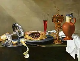 - Isaac Wigans, A still life with a silver tazza, a pie, a peeled lemon, a flute glass, a goblet and an earthenware jug on a draped table at Galerie Lowet de Wotrenge