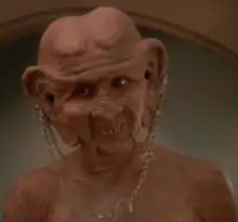 In "Family Business", Ishka is introduced as a Ferengi widow who receives a monthly stipend from her elder son, Quark (Armin Shimerman). Per Ferengi law, she is forbidden from making profit or wearing clothing, yet she has begun doing both and is found out by the Ferengi Commerce Authority (FCA; an agency essentially equivalent to the United States' Internal Revenue Service).[1] The FCA charges Quark with his mother's misdeeds, about which she is unrepentant, feeling that women should have the same rights and privileges as men. After much arguing with Quark, Iskha agrees to sign a confession and forfeit her earnings for her son's sake, though she confides in Rom (Max Grodénchik) that she only gave up a third of what she had hidden away.
