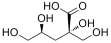 In acidic solutions the acid tends to form a 5-membered ring (lactone) by forming an ester between the carboxylic acid group and one of the alcohols. When treated under anhydrous conditions with acetone, an acid and a dehydration agent two of the alcohol groups can be protected as a cyclic acetone acetal thus leaving behind only one alcohol,[3] prolonged treatment with 2,2-dimethoxypropane forms a protected form of ISA where all four of the alcohol groups are protected as acetone acetals and the carboxylic acid is in the form of the methyl ester.[4] These protected forms of ISA have been used as a starting material for chiral organic compounds anthracyclines.[4][3]
