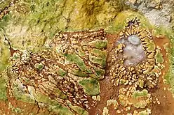 Istisu resort is located in the town of the same name, in Kalbajar District of Azerbaijan, and at an altitude of 2,225 metres (7,300 ft). The springs here were formed as a result of swelling and cracking of the earth's crust after a large seismic event in 30 September 1139, in Ganja.[1][9] Robert Hewsen writes that, in the early Middle Ages, the royal baths of the rulers of Caucasian Albania were located here,[10] though according to other scholars the healing properties of the springs have been known to the local population since the 12th century.[1] Istisu literally means warm water in Azerbaijani.[11] The resulting water has hyperthermic, carbon dioxide, hydro-carbonate-chloride-sulphate-sodium in it. There are 12 active mineral springs within the resort. The temperature of the mineral water is 58.8 celsius. These spring waters are rich in lithium, bromine, iodine, arsenic, phosphorus, zinc, copper, nickel, magnesium, iron and other chemicals. One of these springs has a fountain up to 8 meters high. Some 4 million litres of water are released annually from hot springs. Most of this water flows into rivers.[12]