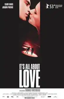 It's All About Love is a 2003 English-language Danish romance-drama film written and directed by Thomas Vinterberg. Its narrative can be classified as apocalyptic science fiction, but Vinterberg prefers to call it "a dream". Unlike the director's earlier Danish-language films, It's All About Love is entirely in English and stars Joaquin Phoenix, Claire Danes and Sean Penn. The production was led by Denmark's Nimbus Film, but the film was largely an international co-production, with involvement of companies from nine different countries in total. It was very poorly received by film critics.