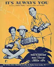 "It's Always You" is a song written by Jimmy Van Heusen (music) and Johnny Burke (lyrics) for the 1941 film Road to Zanzibar. In the film it was sung by Bing Crosby[1] to Dorothy Lamour as they paddled a canoe up a jungle river. It was also used briefly in a comedy scene in the film as a quasi-requiem for Lamour's character, who was erroneously thought to have been killed by a leopard.