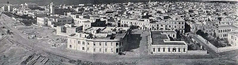 The first Italian infrastructures in Benghazi dated at the time of the conquest, in late 1911, when was done the enlargement of the small Ottoman port that was greatly improved and when was created the communication network with the interior through the construction of two railway lines. Between 1922 and the early thirties the Italian government was organizing an Italian-populated center in the area that overlooked the harbour, encircling the Arab city,[19] as it happened in the initial period with the Military barracks "Generale Torelli", the Military "Autogruppo" and other equipments & infrastructures of this type.