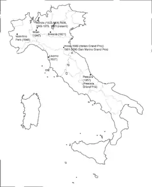 The first Italian Grand Prix took place on 4 September 1921 at a 10.7-mile (17.3 km) circuit near Montichiari.[1] However, the race is more closely associated with the course at Monza, a racing facility just outside the northern city of Milan, which was built in 1922 in time for that year's race, and has been the location for most of the races over the years.