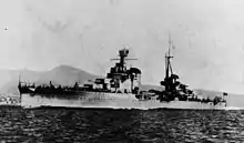 Upon Italy's entrance into the Second World War on 10 June 1940, Bolzano was assigned to the 2nd Division in the 2nd Squadron, along with the two Trento-class cruisers.[4] On 9 July, the ship took part in the Battle of Calabria; there, she led the line of Italian heavy cruisers as they engaged their British counterparts. She was hit by a salvo of three 6-inch (152 mm) shells at 16:05 that killed two crewmen and jammed her rudder to port, forcing her to turn in a tight circle. The shells also hit her forward superfiring gun turret, though it was still able to fire.[3][5] The hits had come from the light cruiser HMS Neptune.[6] After the two fleets disengaged, Italian aircraft misidentified the ship as a British vessel and attacked her, though they failed to score any hits. She reached La Spezia on 12 July, where her battle damage was repaired. By the night of 11–12 November, Bolzano had been moved to Taranto; she was present during the raid on Taranto that night, but was not attacked by the British torpedo bombers.[3] A wave of horizontal bombers was tasked with attacking Bolzano and the two Trentos, but their captains decided to hold their fire; as a result, the British aircraft were unable to locate the three cruisers in the darkness and they attacked other vessels.[7]