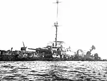 San Giorgio's main role was to supplement the anti-aircraft defences of Tobruk; between June 1940 and January 1941, she claimed 47 enemy aircraft shot down or damaged.[26][27] When Commonwealth troops surrounded Tobruk and prepared to storm it during Operation Compass, in January 1941, the ship was kept in port as it was thought that her main guns could be useful for halting, at least temporarily, the British tanks. Therefore, San Giorgio remained in Tobruk and participated in the defense of the town with her armament. The ship was seaworthy (she had been stationary since June 1940, but she was not immobilized), and when the fall of Tobruk appeared imminent the local naval commander Admiral Massimiliano Vietina requested authorization from the naval high command in Rome (Supermarina) for her to leave, so as to avoid what was perceived as the preventable loss of a perfectly sound, if outdated, cruiser; however, the Italian commander-in-chief in Libya, Marshal Rodolfo Graziani, opposed San Giorgio's leaving, "…so as not to deprive the fortress of the contribution of San Giorgio’s guns and especially for moral reasons, since the departure of the ship would be harmful for the land troops' [morale] [if it were to happen] right at the moment the enemy attack is underway". The Italian Supreme Command decided that the ship should stay. Therefore, San Giorgio remained in Tobruk and kept firing on the attacking land forces throughout the battle, until the town had fallen. In the early hours of January 22, after the last resistance in Tobruk had ceased, the crew was disembarked and a small scuttling party, headed by Captain Stefano Pugliese, blew up her magazines so that she would not fall intact into British hands. Most of the crew, including the badly wounded Pugliese (who had been injured by the premature explosion of one of the scuttling charges), were taken prisoner, although a small party managed to escape to Italy in a fishing boat, carrying with them San Giorgio's war flag.[26][21] The ship was awarded the Gold Medal of Military Valor (Medaglia d'Oro al Valor Militare) for her actions in the defence of Tobruk.[28] Inspection of San Giorgio's torpedo nets, after the fall of Tobruk, revealed that as many as 39 torpedoes, most of them launched by British aircraft, had become stuck in the nets in her seven months of wartime service.[26]