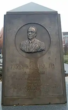Allen took the helm of the Ivan Allen Company, his father's office supply business, in 1946 and within three years had the company bringing in annual revenues of several millions of dollars.[1] In 1961, he authored a white paper for revitalizing Atlanta. It was adopted by the Atlanta Chamber of Commerce and became the Six Point Forward Atlanta program. This plan would become his roadmap as mayor for creating an economic surge that established the infrastructure, business, education, arts, sports, and international presence that are the foundations for modern Atlanta.[2] Allen was a founding member of Atlanta's influential Commerce Club, which he chaired until his death in 2003.[3] He became president of the city Chamber of Commerce in 1961 and during this same year ran for mayor, defeating the staunch segregationist, Lester Maddox.[2]