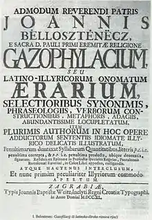 Belostenec wrote poems (which are lost) and sermons (Ten Commandments About The Eucharist, 1672). His main work was a bilingual dictionary Gazophylacium, seu Latino-illyiricorum onomatum aerarium (Gazophylacium or Illyrian-Latin treasury of words; the other copy of the book has the name Gazophylacium illyrico-latinum). The work remained unfinished. Except for its richness of words, (about 40,000 words on 2,000 pages of text) Gazophylacium is also important for its trilingual concept (kajkavian-chakavian-shtokavian) characteristic for the members of the Ozalj literary-linguistic circle. Gazophylacium was finished and prepared for publication by two Paulists - Jerolim Orlović and Andrija Mužar, it was published in Zagreb 1740.