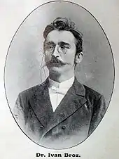 Broz was born in Klanjec where he attended primary school, then moved to primary school in Varaždin, and gymnasium in Karlovac, Požega, and Zagreb, where he graduated. In Innsbruck, he started studying theology, but eventually abandoned it in order to study Croatian language, history, and geography at the newly established Croatian university in Zagreb. He served as a substitute teacher in Zagreb, and as a regular teacher in the upper secondary schools in Osijek, Požega, and Zagreb. He received his PhD in 1888,[1] attended Vatroslav Jagić's lectures on Slavic studies in Vienna, and set off on a fieldwork journey across Bosnia and Herzegovina and southern Croatia, where he eventually grew ill, which was the cause of his death. Ivan Broz died in Zagreb.