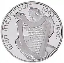 - "Notes and Coins" - Central Bank and Financial Services Authority of Ireland. "This beautiful Silver Proof €15 coin celebrates the 80th anniversary of the original coin design 'Girl with Harp' which was gifted to the Irish State by Ivan Meštrović in 1927. This design was submitted by the artist as an entry in the competition for the design of the 1928 Irish Free State coinage. Unfortunately, because of difficulty contacting him – he was in the United States - his design arrived too late for consideration. The Chairman of the Design Committee, William Butler Yeats, subsequently wrote "He made one magnificent design and, on discovering that the date had passed, gave it to the Irish Free State with great generosity". It has been used as the seal of the Central Bank since 1965.