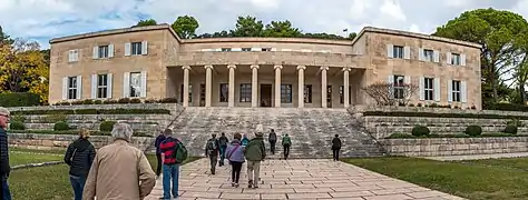 During the April War in 1941 Meštrović was living in Split. After being warned by novelist and Independent State of Croatia (NDH) minister Mile Budak that the Croatian authorities could not guarantee his safety in Split, he moved to Zagreb in September 1941.[14] Meštrović and painter Jozo Kljaković were arrested by the Ustaše in Zagreb on 7 November 1941, ostensibly due to the regime's fears that the two would emigrate. He eventually served three and a half months in the Savska Cesta prison. With help from archbishop Aloysius Stepinac and subsequently the Vatican he was released, on condition that he travel to Venice to attend the Independent State of Croatia pavilion at the Venice Biennale. From there he relocated to Rome, where he stayed and worked at the Pontifical Croatian College of St. Jerome. He was sponsored here by Fra Dominik Mandić, and during his time in the city was received by Pope Pius XII. In July 1943, Meštrović secured a visa to Switzerland through NDH diplomat Stijepo Perić and moved there. Not all of his family managed to escape — his first wife Ruža died in 1942 and many from her Jewish family were murdered in the Holocaust. Later, his brother Petar was imprisoned for publicly advising Ivan not to return to the country.[15] Marshal Josip Broz Tito's government in Yugoslavia eventually invited Meštrović to return, but he refused to do so. In 1946, Syracuse University offered him a professorship, and he moved to the United States.[16] He became the first artist of Croatian origin to exhibit his work at the Metropolitan Museum of Art in New York City in 1947.[8]