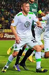 Olić signed for VfL Wolfsburg at the start of the 2012–13 season.[16] He scored his first Bundesliga goal for Wolfsburg against Greuther Fürth, and he netted another one against Fortuna Düsseldorf. He started the season with a hat-trick against Schönberg 95 in the 2012–13 DFB-Pokal. He scored another goal in the quarter-final match of the DFB-Pokal against Kickers Offenbach on 26 February 2013, as Wolfsburg secured a spot in the semi-finals. He produced an "acrobatic overhead kick" to score the first of his two goals in a 5–2 win against SC Freiburg in March 2013.[17] He finished the season as first-choice striker for the club, with 15 goals and 6 assists. On 24 April 2014, Olić signed a new two-year deal with the German side.[18] In the opening match of the 2014–15 Bundesliga season, he scored a spectacular goal against his former club Bayern Munich.[19]