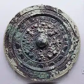 The Izumi Koganezuka Kofun is a zenpō-kōen-fun (前方後円墳), which is shaped like a keyhole, having one square end and one circular end, when viewed from above. It is located at the northwestern end of Shintayama hill, surrounded paddy fields, but the location is also close to the ancient provincial capital of former Izumi Province. The tumulus has a total length of about 94 meters. The presence of a kofun at this location has been known since antiquity, but in November 1945, a 17-year-old student noticed that the tumulus was severely damaged and convinced local authorities that a rescue archaeology excavation be performed. At that time, a leather-lacquered shield with copper decorations, iron swords and other metal artifacts were discovered. In 1950 to 1951, further excavation of the posterior circular portion by the Osaka Prefectural Board of Education and the Japanese Archaeological Association found the burial chamber within which three clay-covered wooden caskets were found side by side. The central casket had the remains of a woman, and she was flanked on either side with the remains of two men. Within and surrounding these coffins were a large quantity of grave goods, including Shinju-kyo mirrors, magatama beads and other jewelry, fragments of armor and a helm, iron swords, spears and other weapons, and other artifacts. The inscription of one of the mirror gave the reign date of Keisho 3, which corresponds to 238 AD. This drew great attention by historians, as per the Chinese chronicle Wei zhi (魏志 "Records of Wei"), which is part of the Records of the Three Kingdoms (三國志), in the year 239 AD Emperor Cao Rui sent "one hundred bronze mirrors" to Queen Himiko of Wa ,[3] and it was possible that this was one of these mirrors. These excavated items are now are in the possession of the Tokyo National Museum.[4]