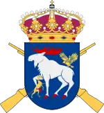 The coat of the arms of the Jämtland Ranger Regiment (I 5/Fo 22) 1977–1994, the Jämtland Ranger Brigade (Fältjägarbrigaden, NB 5) 1994–2000 and the Jämtland Ranger Regiment (I 5) 2000–2004. Blazon: "Azure, the provincial badge of Jämtland, an elk passant argent, attacked on the back by a rising falcon and in the front by a dog rampant both or; all animals armed and langued gules. The shield surmounted two muskets in saltire or".[6] The coat of arms of the Jämtland Ranger Regiment (I 5/Fo 22) 1994–2000 and the Jämtland Group (Jämtlandsgruppen) since 2000. Blazon: "Azure, the provincial badge of Jämtland, an elk passant argent, attacked on the back by a rising falcon and in the front by a dog rampant both or; all animals armed and langued gules. The shield surmounted two swords in saltire or".[6]
