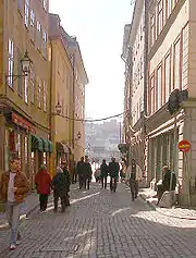 The street used to be the main approach to the city from Södermalm, and it was accordingly called Stora gatan ("Big Street").[2] A now closed alley, the location and extent of which is documented in great detail, used to pass in parallel to the street through the blocks on its eastern side. (See ref, page 19.)[1]