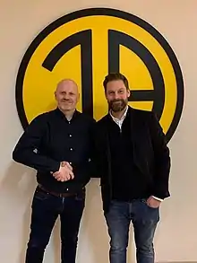 ![]() Jón Þór Hauksson við ÍA chairman Eggert Hjelm Herbertsson | |||