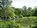 In 1938, a monument to Stanisław Moniuszko was erected on the main axis of the park, unfortunately, destroyed by the Germans a year later. During World War II, the Germans closed the park for Poles and Jews,[3] and most of the conifers that remained from the city forests were cut down, the perennial garden was also liquidated, and tennis courts were built in its place (currently the Municipal Tennis Club). During the war, the bottom of the pond was also destroyed, which was not rebuilt until 1957.