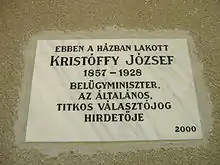 Memorial tablet of Kristóffy (Makó, birthplace)