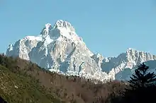 With its elevation of 2,752 metres (9,029 ft), it is the second highest mountain of the Julian Alps, surpassed only by Triglav. The Julian Alps are part of the Southern Limestone Alps System.