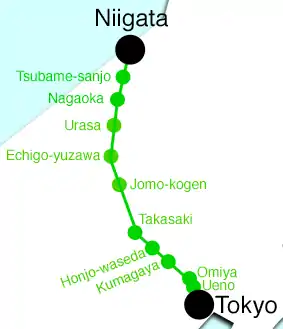 The Jōetsu Shinkansen (上越新幹線) is a high-speed shinkansen railway line connecting Tokyo and Niigata, Japan, via the Tōhoku Shinkansen, operated by the East Japan Railway Company (JR East). Despite its name, the line does not pass through the city of Joetsu or the historical Jōetsu region, which instead are served by the Hokuriku Shinkansen.