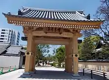 The Hakata Sennen Gate (Hakata-sennen-no-mon (博多千年門)), the new symbol of the Hakata area, was completed at the entrance of Jōtenji-dori Avenue on March 28, 2014. It is a wooden four-legged gate with a tile roof, and was modeled on Tsuji-no-dōkuchi-mon (辻堂口門), the gateway of Hakata which appears in ancient documents. Height and length are each approximately 8 metres. It was named in the hope of prosperity for a thousand years in the future of the city of Hakata.[1]