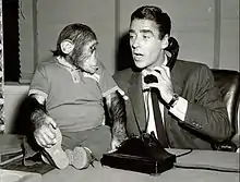 Muggs was born in French Cameroon. He first became popular when he was in Henry Trefflich's pet store in New York; a "name that chimp" contest led to his being named Mr. Muggs, to which the Today Show later added "J. Fred".[4] Carmine "Bud" Mennella and Leroy "Roy" Waldron, former NBC pages, bought him for $600 when he was 10 months old, and Mennella trained him.[5][6] He appeared on the Perry Como Show and Pat Weaver of the Today Show saw potential in him;[7] Mennella had an appointment with NBC executives for Muggs to audition for the Today Show, but missed it; however, Muggs' antics in a coffee shop led the president of the network to offer him a contract anyway.[5] Muggs first appeared on the show on February 3, 1953, dressed in diapers like a baby.[4][8]