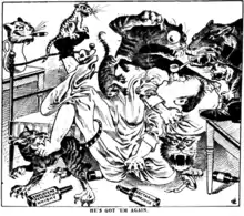 In 1888 he famously exhibited, in a Bourke Street shop window, an oil painting satirizing the free market champion Henry Parkes as King Lear with the dying Cordelia (representing the NSW economy) in his arms.[12] A similar cartoon, reportedly published in Melbourne Punch,[13] has yet to be found.