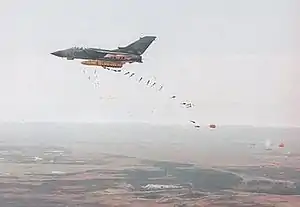 Deployment was rather frightening for the flight crew, since it required the aircraft to fly low, straight and level over an enemy airfield, and when over the runway the pods would dispense their payload. During the Gulf War it was widely reported in the popular press that Tornados were shot down by AAA fire and MANPADS during delivery of the JP233 munition,[3] but in fact none of the losses occurred during the attack phase of a JP233 mission. Only one aircraft was lost carrying the JP233 munition when Tornado ZA392 crashed into the ground approximately 16 km (10 mi) after delivering the weapon at low level; enemy fire was not reported and it was believed that this was an incident of controlled flight into terrain.[4]