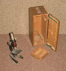 There were several models of microscope, all similar in design but differing in size. They were simple but well made instruments with sturdy cast alloy frames. They were supplied in a wooden or cardboard box complete with several glass slides, tweezers and instruction leaflet.